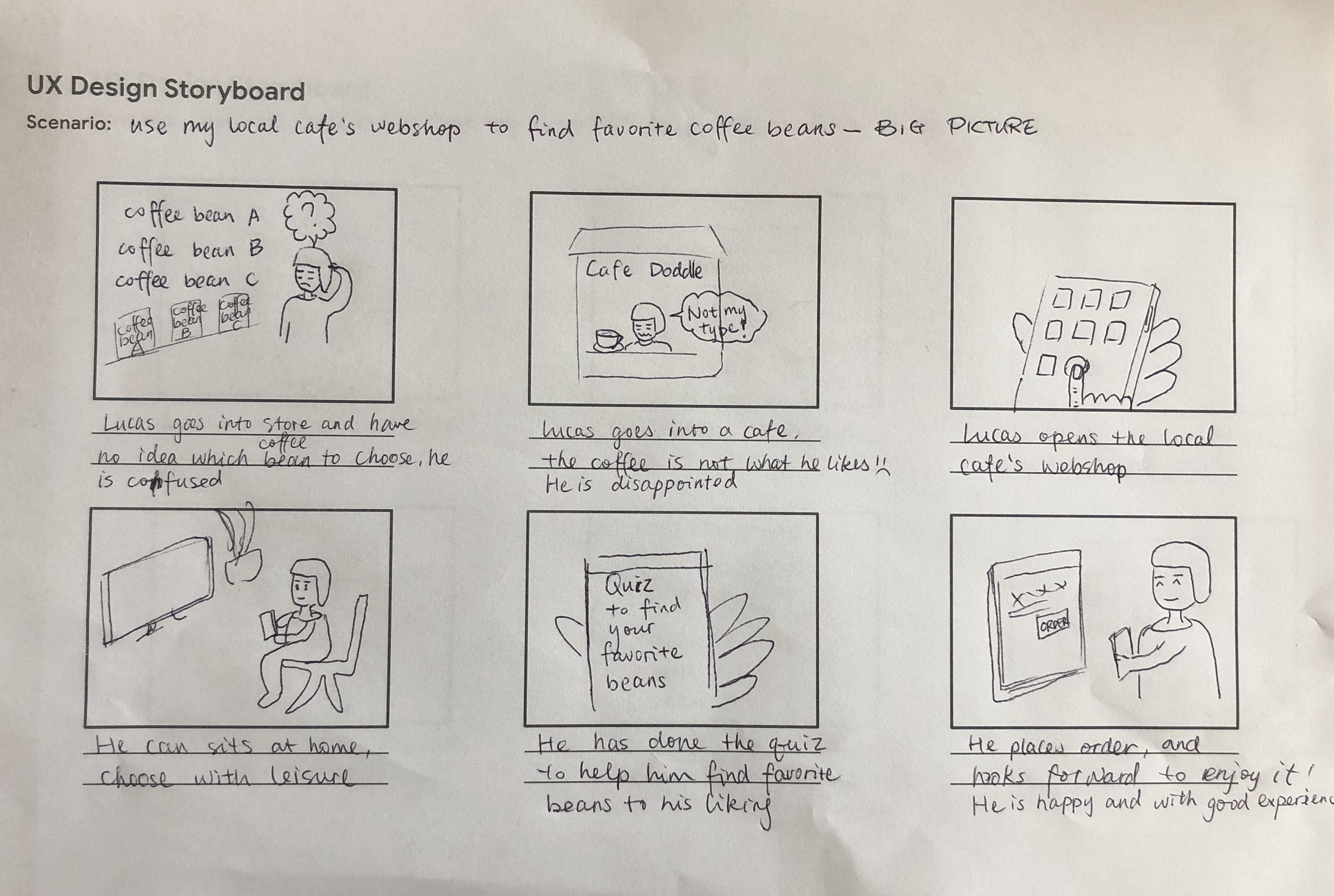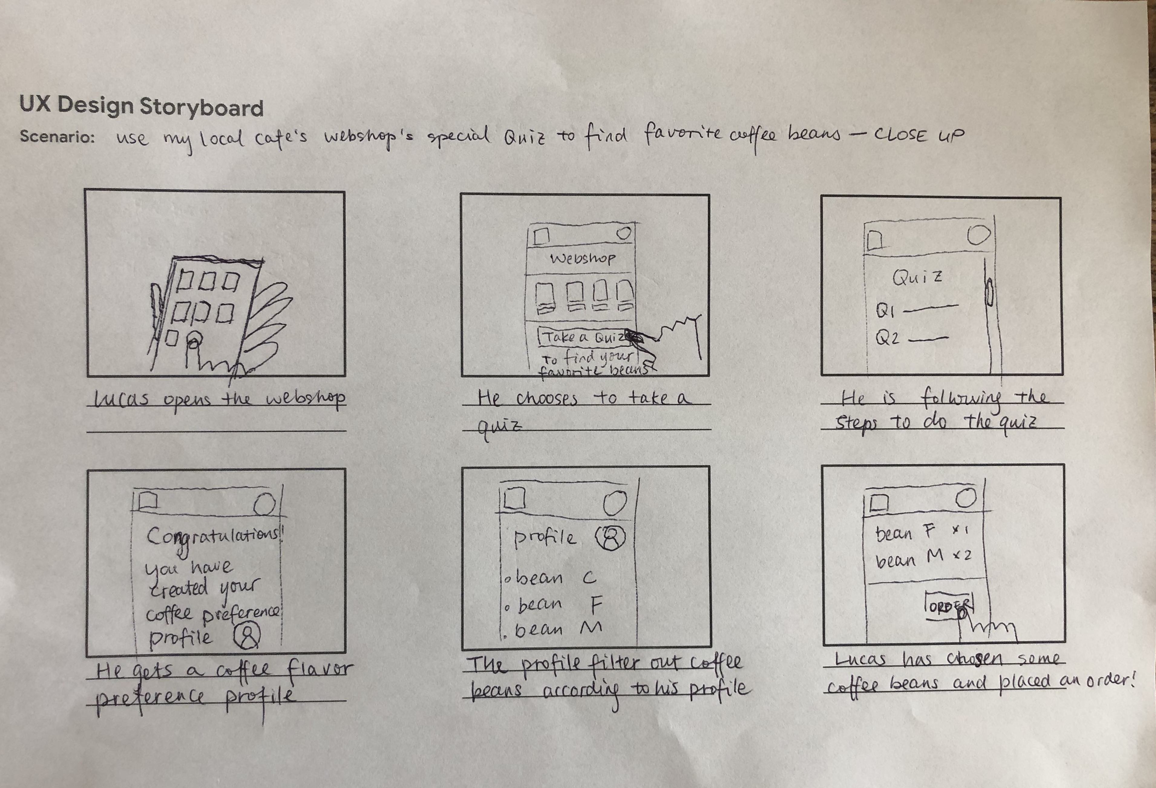 With the aid of storyboards, we had decided to create a section called “Quiz” incorporated in the online webshop. By using the Quiz, users could quickly identify their coffee flavor preference; and at the same time, users could be directed to recommended coffee beans in the webshop, which were found in the result of the Quiz.